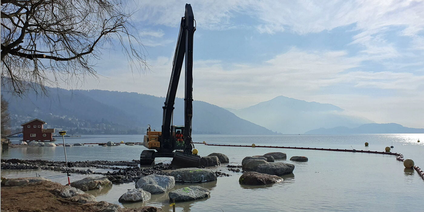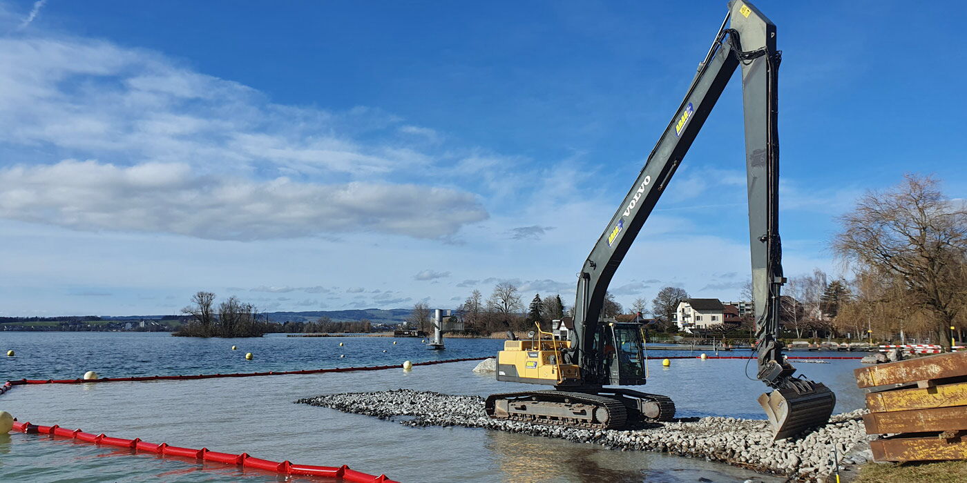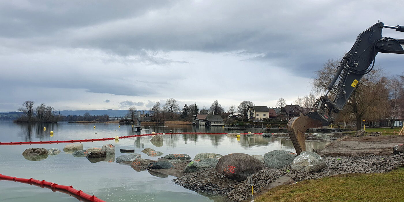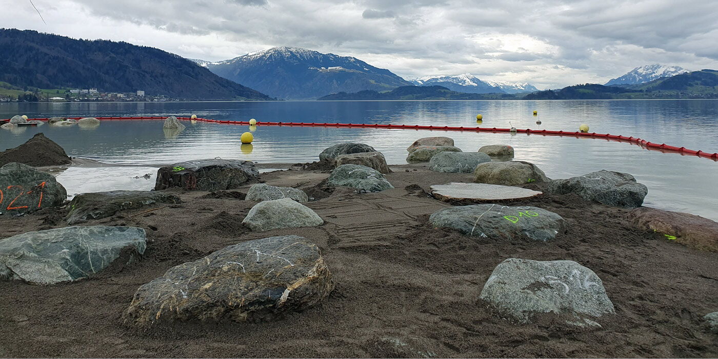Das Strandbad Chamerfussweg in Zug wird saniert. SK& zeigt sich für sämtliche Wasserbauarbeiten verantwortlich und begleitet derzeit die Realisierung. Der neue Strand und Flachwasserbereich wird künftig mit zwei Buhnen gesichert. Die Buhnen bestehen aus Kies und bis zu 20 Tonnen schweren Findlingen. Diese Findlinge werden im Seegrund eingebunden und bilden später das Fundament für einen Badesteg. |