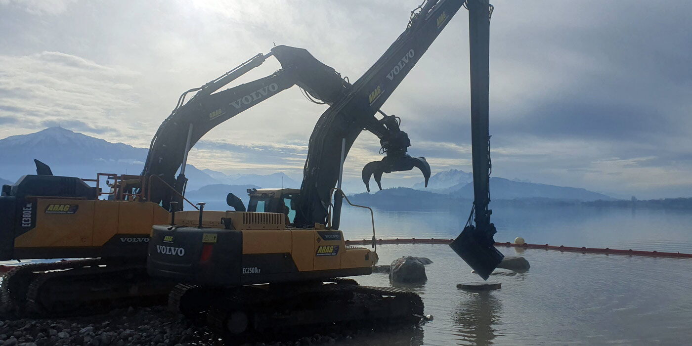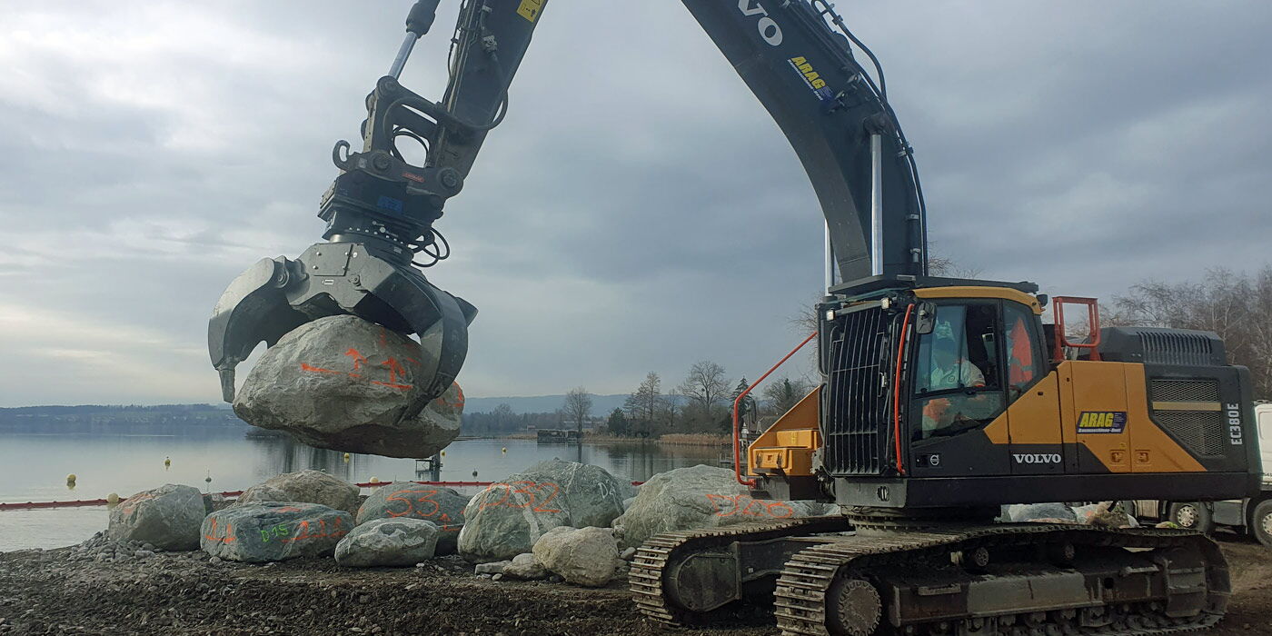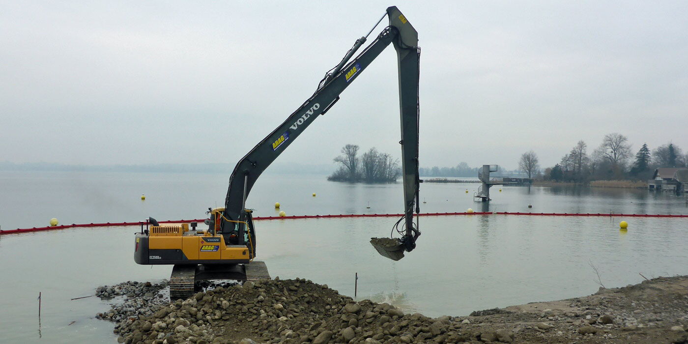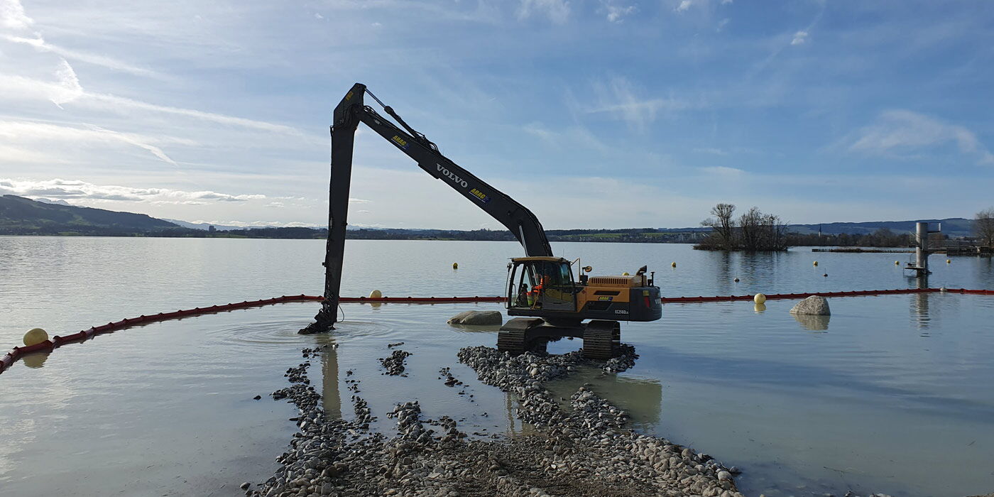 Das Strandbad Chamerfussweg in Zug wird saniert. SK& zeigt sich für sämtliche Wasserbauarbeiten verantwortlich und begleitet derzeit die Realisierung. Der neue Strand und Flachwasserbereich wird künftig mit zwei Buhnen gesichert. Die Buhnen bestehen aus Kies und bis zu 20 Tonnen schweren Findlingen. Diese Findlinge werden im Seegrund eingebunden und bilden später das Fundament für einen Badesteg. |