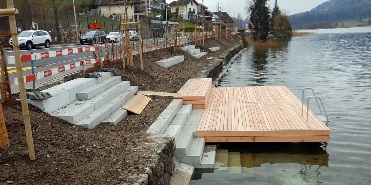 Neuer Seezugang beim Schulhaus Morgarten am Ägerisee, Erstellung einer Badeplattform, Planung und Umsetzung, sichere und attraktive Badezone, direkte Seezugang |