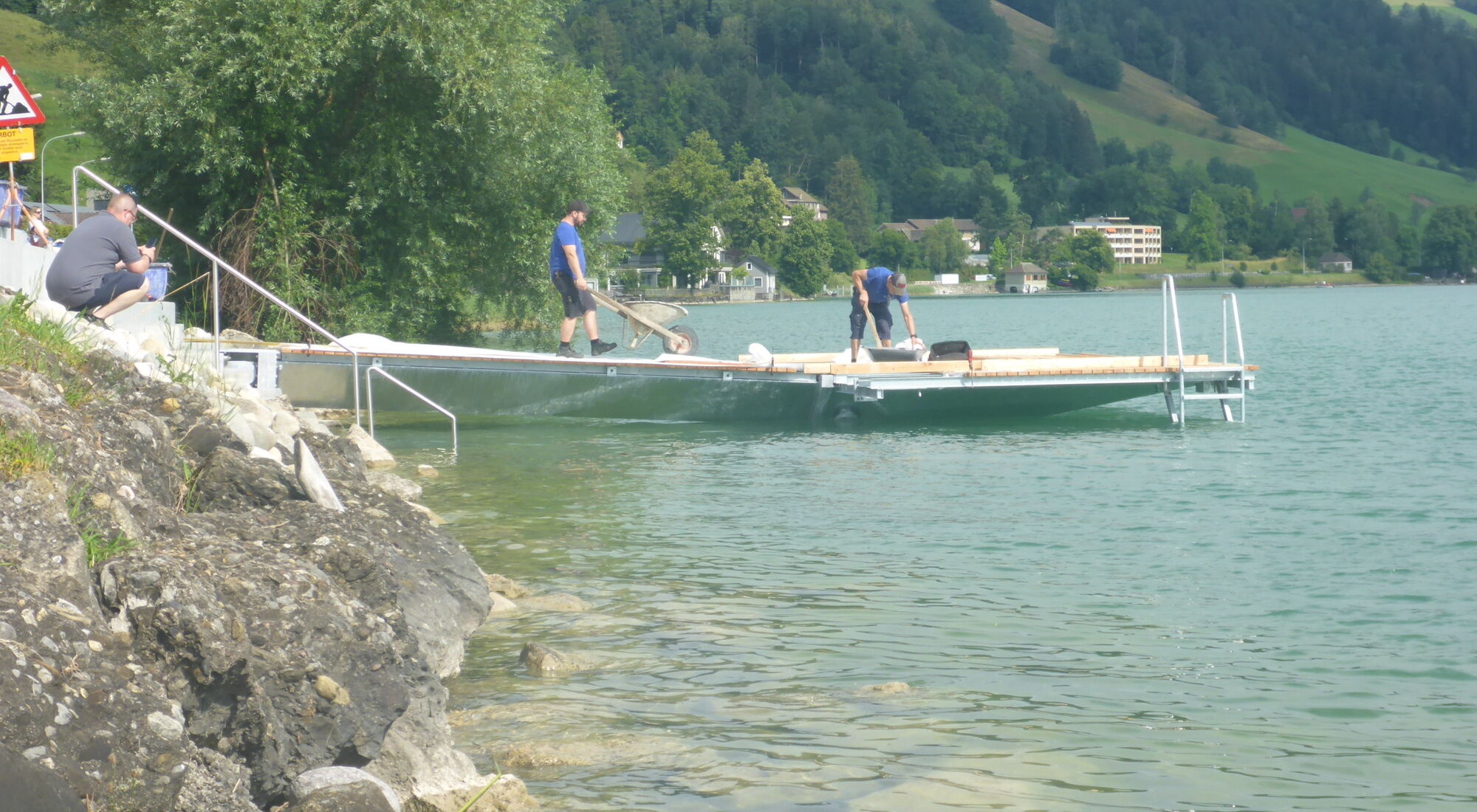 Für das Badefloss in Oberägeri haben wir einen anderen Ansatz gewählt. Ein eigens auf Eisdruck dimensioniertes Badefloss wurde anfangs dieser Woche versetzt. Die verzinkte Stahlkonstruktion besitzt zwei Auftriebskörper. Das Floss ist am Ufer über einen beweglichen Zugangssteg fix verankert und hält vollständigem Eisdruck stand.