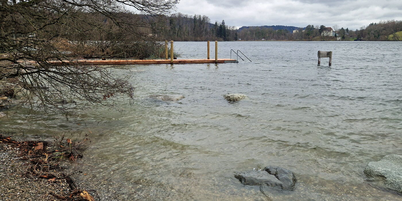 Neuer Seezugang beim Schulhaus Morgarten am Ägerisee, Erstellung einer Badeplattform, Planung und Umsetzung, sichere und attraktive Badezone, direkte Seezugang |