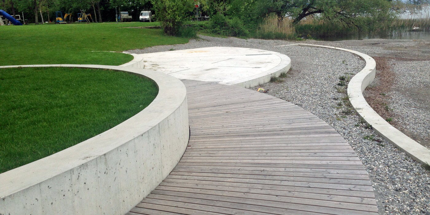 Die bestehende Uferkonstruktion wurde abgebrochen und durch ein Flachufer bzw. Kiesstrand ersetzt. Um den Höhenunterschied zwischen der bestehenden Liegewiese und dem Wasser zu überwinden, wurde ein in drei Ebenen gegliederter Seezugang aus Ortsbeton angelegt. |