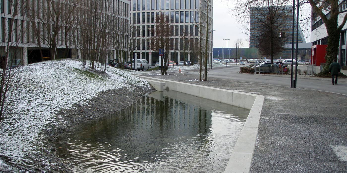 | Projektbeschrieb: | Erstellung eines Bachrinnes mit Auslauf- und Umleitbauwerken aus Ortsbeton im Projektperimeter Foyer vom Opus-See bis zur Aabachstrasse (3. Etappe der Bachoffenlegung auf dem Siemens-Areal) |
